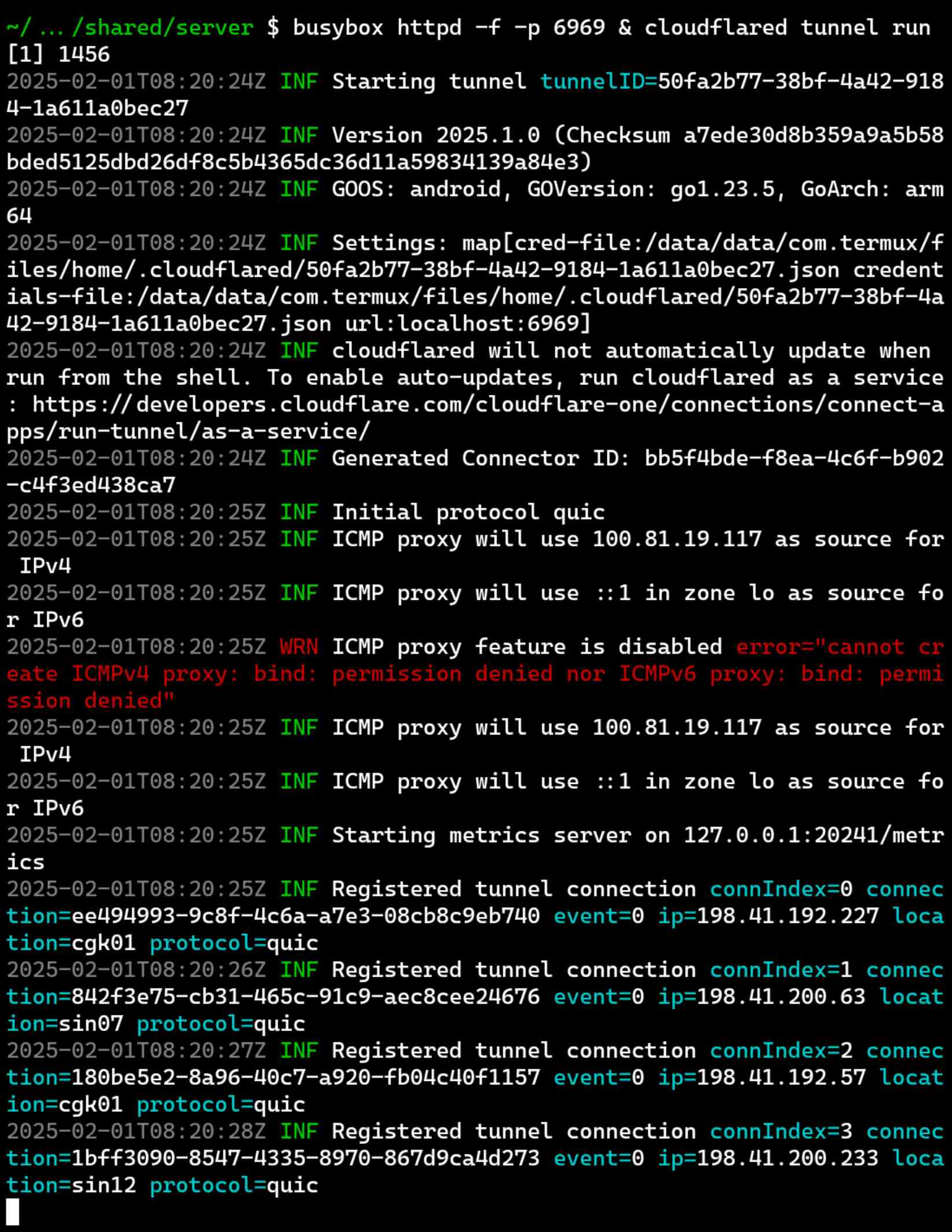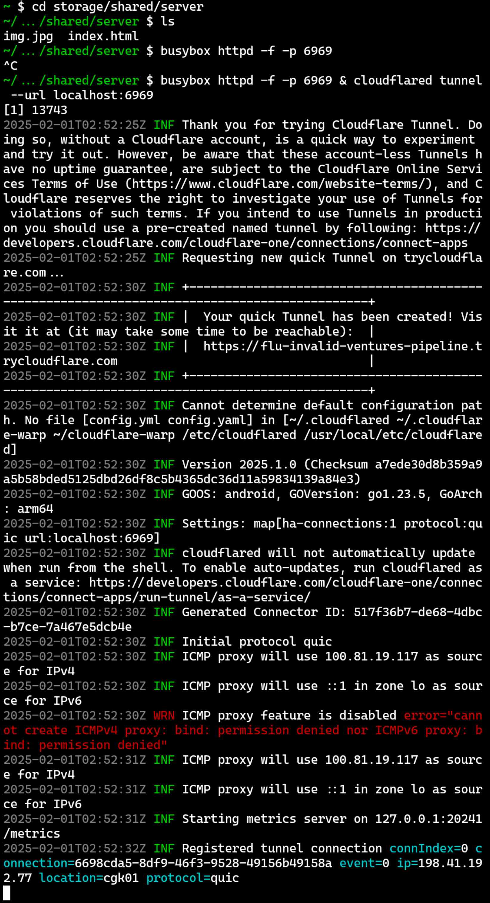 Terakhir kita tinggal mengaktifkan server dan memulai tunnel.busybox httpd -f -p 6969 & cloudflared tunnel run