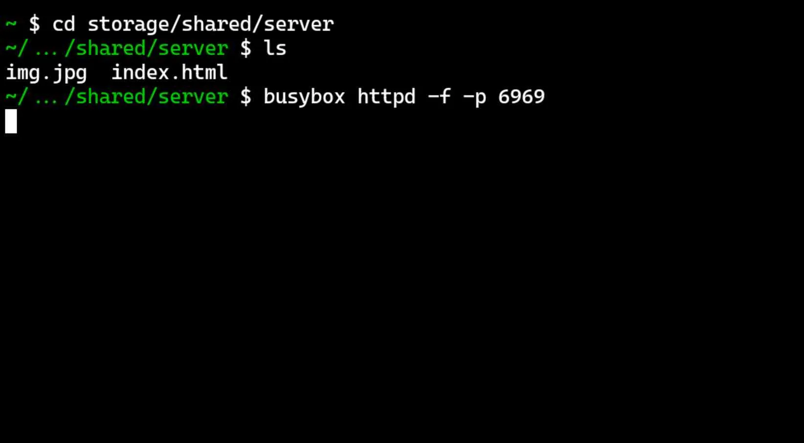 Berikut cara mengaktifkan web servernya, disini saya pakai port keramat.busybox httpd -f -p 6969