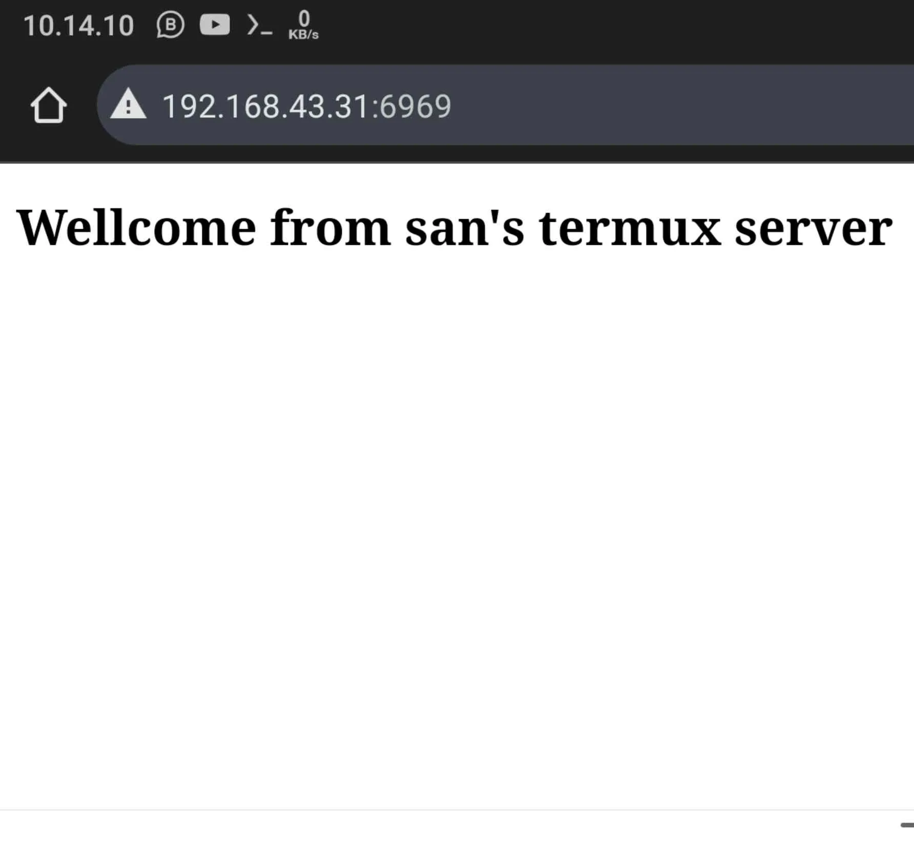 Sekarang server sudah berjalan di localhost:6969 atau sesuai IP device, untuk menghentikannya tekan CRTL+C. Sebelumnya saya sudah membuat file HTML (index.html) sederhana di folder bernama "server" di penyimpanan internal.
